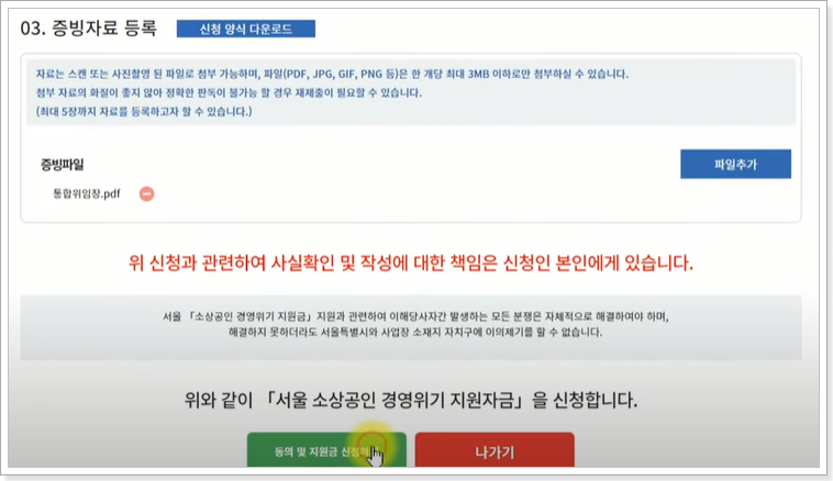 10. 증빙자료를 등록하고 신청 버튼을 클릭합니다.