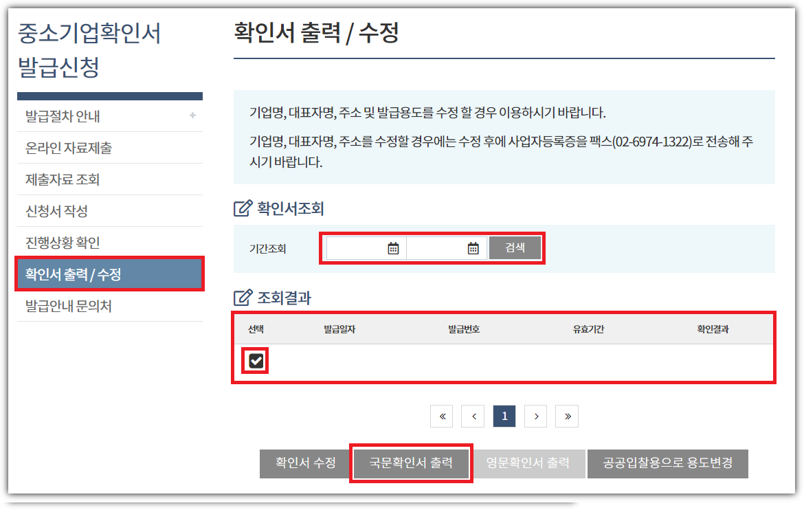 Q. 발급한 확인서 업체명, 대표자명, 주소, 용도 수정은 어떻게 하나요?