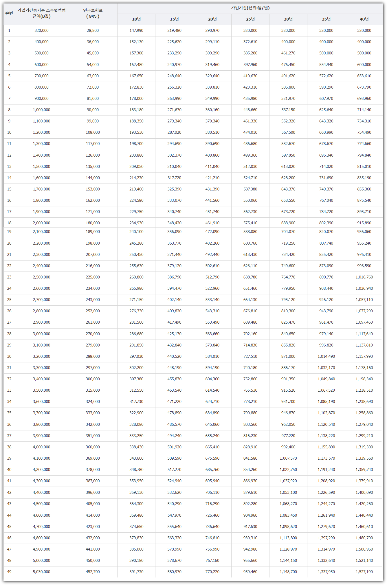 | 가입기간중기준 소득월액평균액(B값) | 연금보험료( 9% ) | 가입기간(단위:원/월) | ||||||