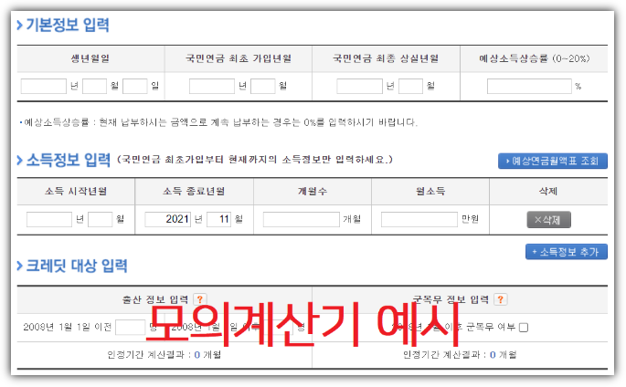 국민연금공단에서는 예상수령액을 모의 계산할 수 있습니다. 예상연금 확인이 가능한 종류로는 노령연금 유족연금 장애 연금 등이 있으며, 기본정보, 소득정보 등을 입력하면 산출방법과 계산요율 등을 통해 예상 수령액을 체크할 수 있습니다. 공인인증서 등의 로그인 과정이 필요없이 간편하게 계산해볼 수 있습니다.
